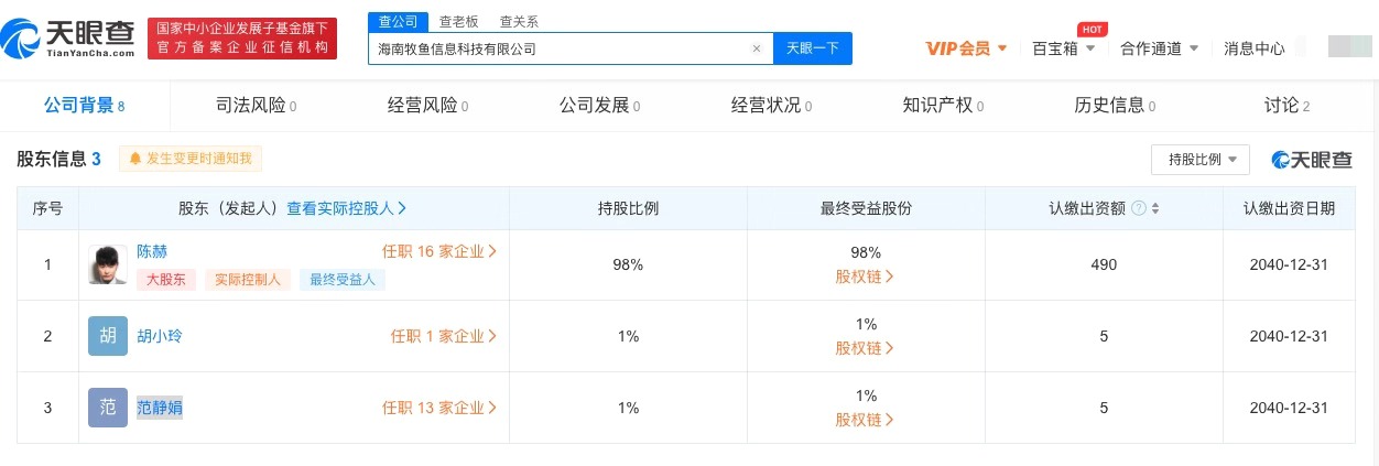 据天眼查APP显示,12月23日,海南牧鱼信息科技有限公司成立,注册资本为500万,经营范围包含:营业性演出;演出经纪;演出场所经营等。陈赫任法定代表人、执行董事兼总经理,胡小玲任监事。该公司由陈赫、胡小玲、范静娟共同持股,持股比例分别为:98%、1%、1%。