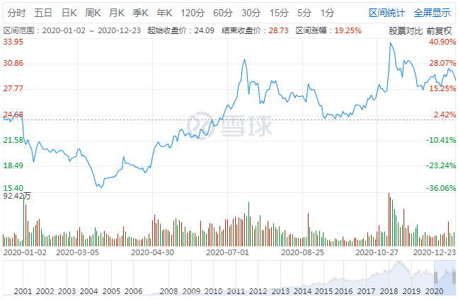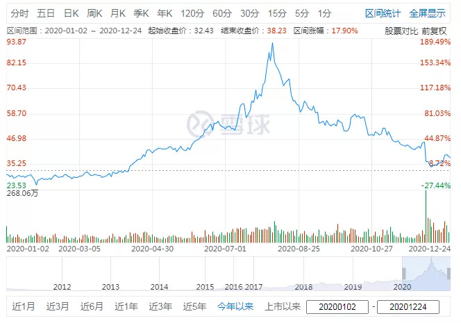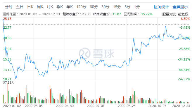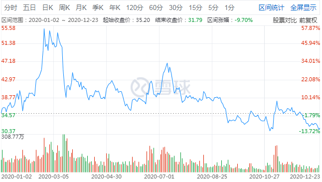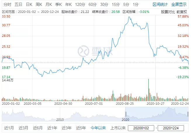 中兴通讯在港交所发布公告称,近期新闻报道中针对公司历史上已经公开报道过的事项涉嫌贿赂进行调查,公司未收到美国政府相关部门就此事的通知,目前生产经营活动一切正常。3月17日、18日,中兴通讯再度大幅下跌,前后3个交易日跌幅23.01%,市值蒸发超500亿。2020年全年中兴通讯股价涨幅-9.7%,截至12月24日报收31.17元/股,较年内最高点跌去42%,总市值1466.61亿。