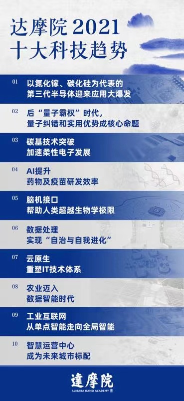 12月28日,阿里巴巴达摩院发布2021十大科技趋势,对包括新材料、AI技术、脑机接口等领域的发展方向做出预测。
