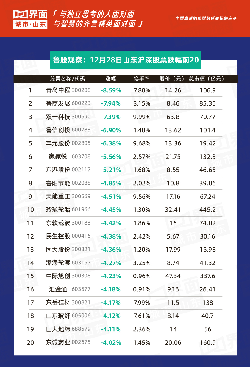 青岛市跌幅榜首:青岛中程(300208),涨幅-8.59%,股价14.26元,总市值106.9亿元;