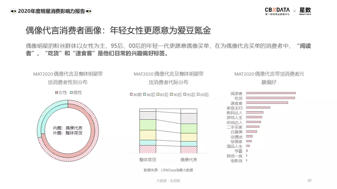 从人群画像上来看,偶像明星的粉丝群体以女性为主,95后、00后的年轻一代更愿意偶像买单,而他们也正是消费市场必然需要争抢的地盘。