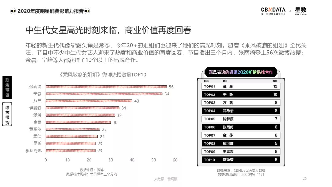 《乘风破浪的姐姐》的播出,不仅让节目中不少中生代女艺人重新被大众认识,也实打实地提升了她们的商业价值。节目播出三个月内,张雨绮登上56次微博热搜;金晨、宁静等人都获得了10个以上的品牌合作。