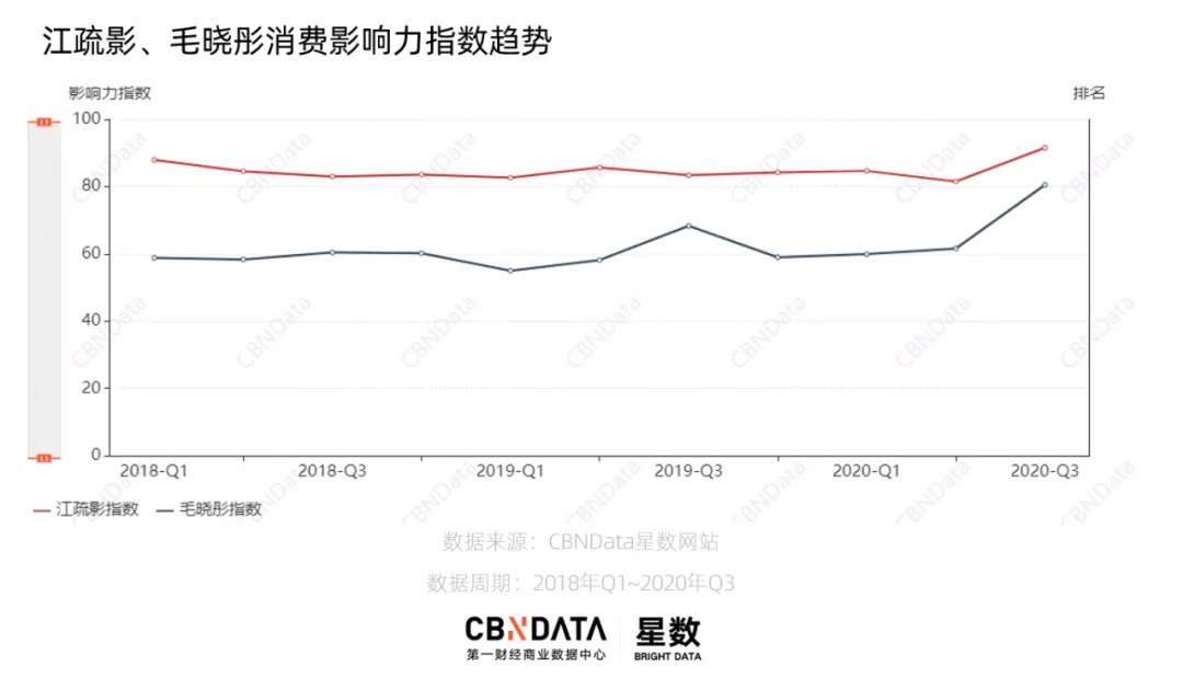 之后,一部聚焦30+女性都市题材的《三十而已》继续引领这一舆论风潮,江疏影、童瑶、毛晓彤三位主演的热度虽不及“姐姐们”,但也在之后不同程度地赢得了品牌青睐。根据CBNData星数消费影响力数据,江疏影和毛晓彤在第三季度的指数有了明显上升。