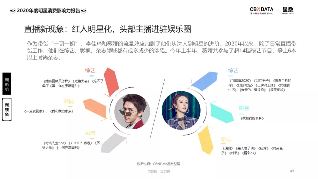除了综艺影视市场之外,直播带货受到疫情催化,成为了新风口。作为打破物质消费和内容消费壁垒的重要形式,直播带货的爆火不仅将薇娅李佳琦等头部直播红人推到时代前沿,也很大程度了更新了明星的身份,逐渐消解了红人和明星之间的壁垒。