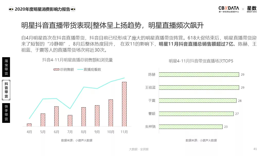 在这波浪潮中,除了以淘宝为首的电商平台,抖音和快手两大短视频平台也成为明星带货的新战场。以淘宝为例,刘涛、汪涵、谢娜、金星等明星陆续在淘宝平台开设个人账号进行直播。根据C站不完全统计,仅6~10月在淘宝上进行定期直播的明星就超过30位,仅第三季度淘宝平台明星直播引导消费金额便突破千亿规模。
