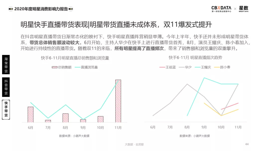 相对之下,通过短视频平台的快手起步较晚,虽然今年来通过明星代言人的形式为自己造了不少势,但整体来看还并未形成明星带货体系,带货销售额波动幅度较大。