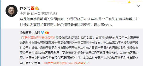 对此,罗永浩28日晚间在个人微博上回应称,该债务是经营手机期间的公司债务。公司已经于2020年12月15日和对方达成和解,并且按计划支付了首付款,剩余债务会按计划支付。