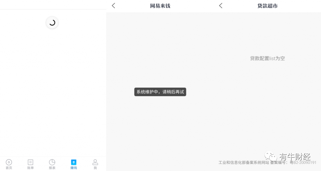笔者登录该APP后发现,网易有钱的部分功能确实已经停摆。除基本功能之外,“赚钱”板块目前已经无法加载出任何内容。个人板块仍有网易来钱和贷款超市两个网易旗下服务可供链接,初登录时还能看到网易来钱的贷款额度,但很快就被“系统正在维护”页面取代;至于贷款超市,其早已显示“贷款配置list为空”,也没有其他的可操作界面。