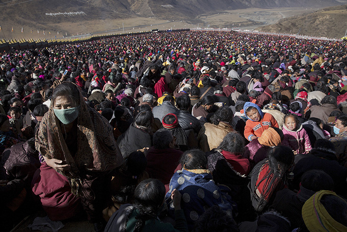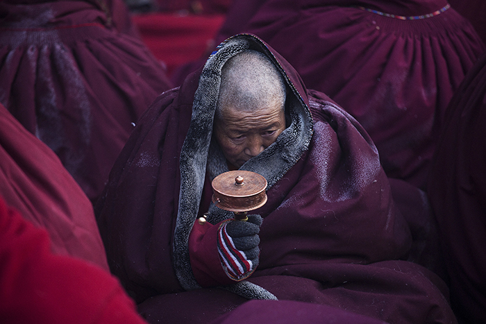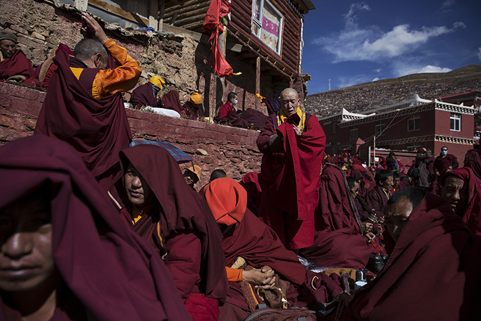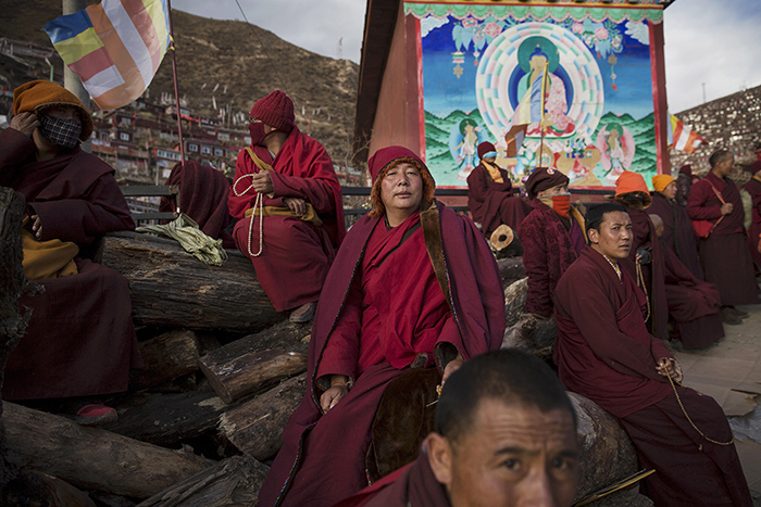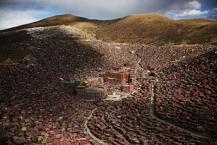 2015年10月30日,四川色达,色达五明佛学院。重重的群山环绕之中,遍布数千僧舍,以佛学院的大经堂为中心,密密麻麻搭满了四面的山坡,不计其数的绛红色小木屋,延绵无数,一眼望不到头。