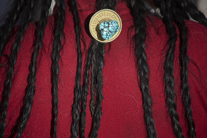 康巴族妇女典型的头饰—传统琥珀和石头。