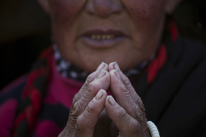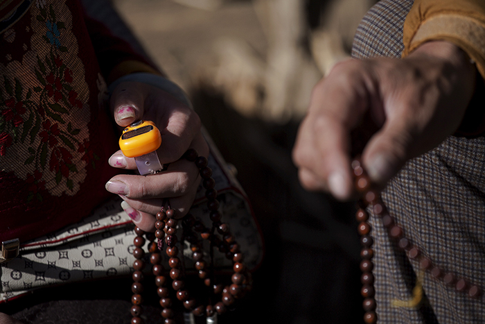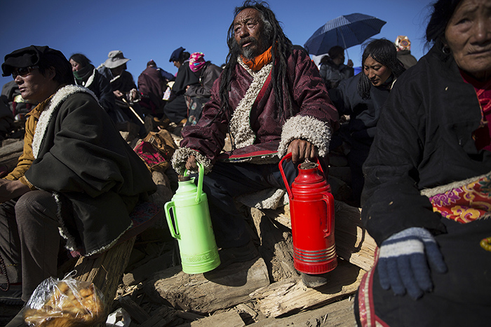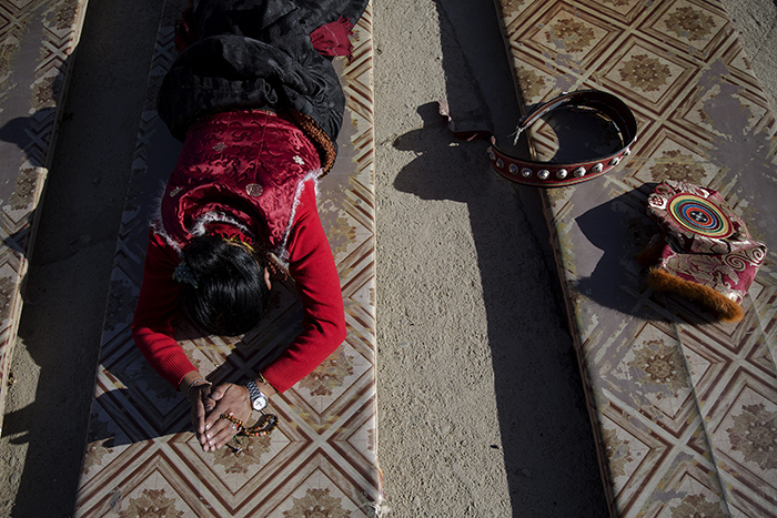 藏族妇女跪地朝拜,将腰带和帽子放在身旁。天气接近零度也无法阻挡人们虔诚的祈福。