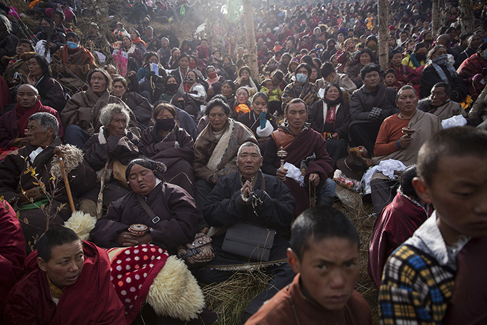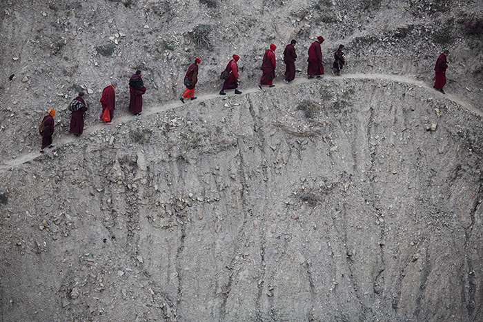 四川色达,参加完每日的讲经后,僧人们沿山路返回宿舍。