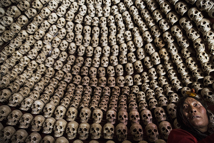 四川色达,一处建筑内全是骷髅头,一名穿着传统服饰的康巴族藏民妇女在建筑内。