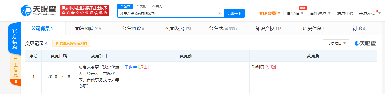 据天眼查APP显示,12月28日,苏宁消费金融有限公司发生工商变更,王琪生退出该公司法定代表人,由孙利勇接任。