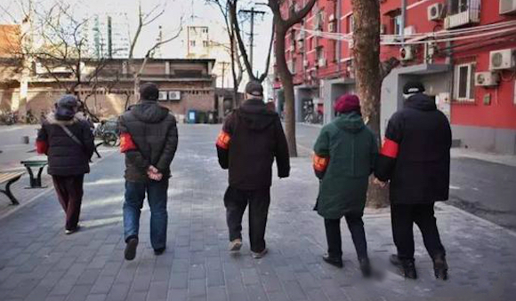 (全国两会临近,一级防控启动。潘家园社区的治安志愿者在他们的点位上巡逻。图片来源:新京报)