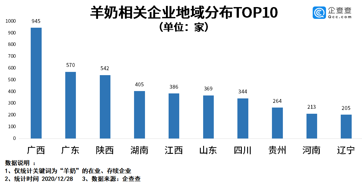 近年来,乳品行业的新秀——羊奶风头大盛,不仅澳优、和氏、百跃、红星美羚等在羊奶市场大展拳脚,就连蒙牛、伊利都放下“大佬”姿态,强势杀入。企查查数据显示,截至2020年底,我国共有6100余家羊奶相关企业,广西省以945家排名第一,广东、陕西分列二三位。近年来,相关企业年注册量逐年攀升,2020年新注册量达到1452家,同比增长14.9%,其中四季度新增企业331家。