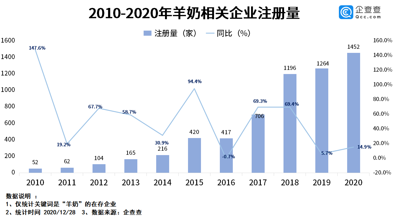 从企业成立时间来看,企查查数据显示,过去十年来我国“羊奶”相关企业的注册量不断增长,且近三年新注册量都在1000家以上。2018年企业注册量突破1000家,同比增长了69.4%。2019年一共新注册了1264家企业,同比增长了5.7%。2020年的注册量是1452家,同比增长了14.9%。