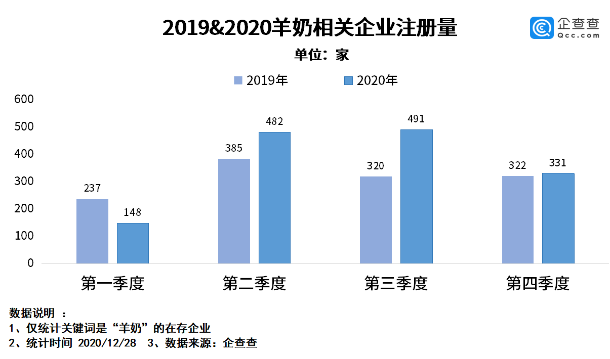 从季度注册量来看,企查查数据显示,相比2019年,2020年羊奶企业二、三、四季度的注册量均呈同比上涨趋势。全年来看,三季度注册量最多,为491家。一季度的注册量最少,为148家。四季度新注册量为331家。