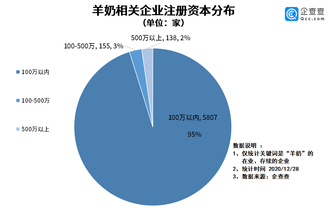 从企业规模来看,企查查数据显示,目前注册资本在100万以内的羊奶企业数量最多,有5800余家,占比总量的95%。其次是注册资本在100-500万之间的企业,有155家,占比3%。企业注册资本在500万以上的羊奶企业最少,有138家,占比2%。