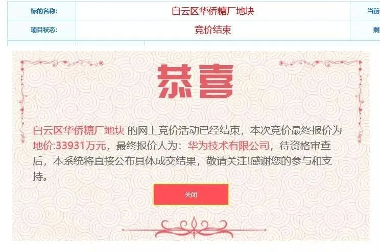 广州市公共资源交易中心显示,华为技术有限公司竞得的白云区华侨糖厂地块,坐落于白云区松洲街,土地使用权出让年限为50年,占地面积119296平方米,建筑总面积166000平方米。