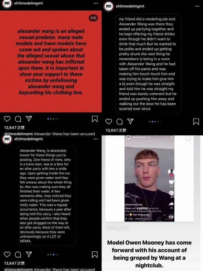 据社交平台Ins上账号@shitmodelmgmt发文称,男模Owen Mooney日前经过Tik Tok平台对华裔设计师Alexander Wang进行了“性骚扰”指控,表示设计师曾于2017年在纽约一家酒吧中对其进行性骚扰。