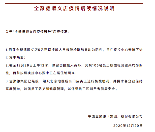 据中国全聚德微信公众号消息,12月29日,全聚德顺义店发布疫情后续情况说明,全文如下: