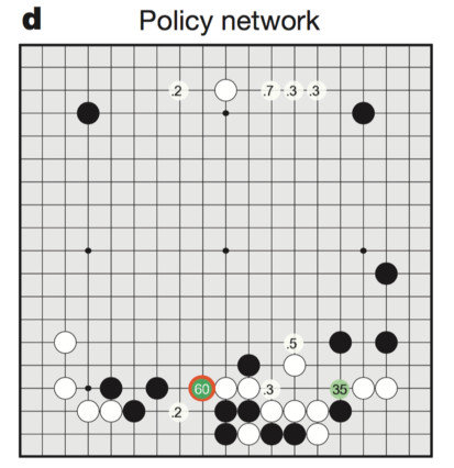 落子选择器是怎么看到棋盘的?数字表示最强人类选手会下在哪些地方的可能。