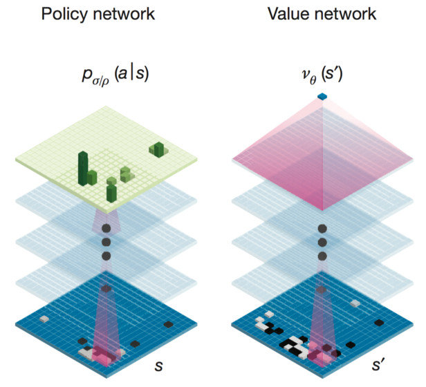 AlphaGo系统事实上需要两个额外落子选择器的大脑。一个是“强化学习的策略网络(Policy Network)”,通过百万级额外的模拟局来完成。你可以称之为更强的。比起基本的训练,只是教网络去模仿单一人类的落子,高级的训练会与每一个模拟棋局下到底,教网络最可能赢的下一手。Sliver团队通过更强的落子选择器总结了百万级训练棋局,比他们之前版本又迭代了不少。