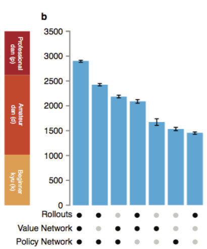 这篇论文包含一个随着他们使用插件的不同,AlphaGo的能力变化和上述步骤的模拟。仅使用独立大脑,AlphaGo跟最好的计算机围棋AI差不多强,但当使用这些综合手段,就可能到达职业人类选手水平。