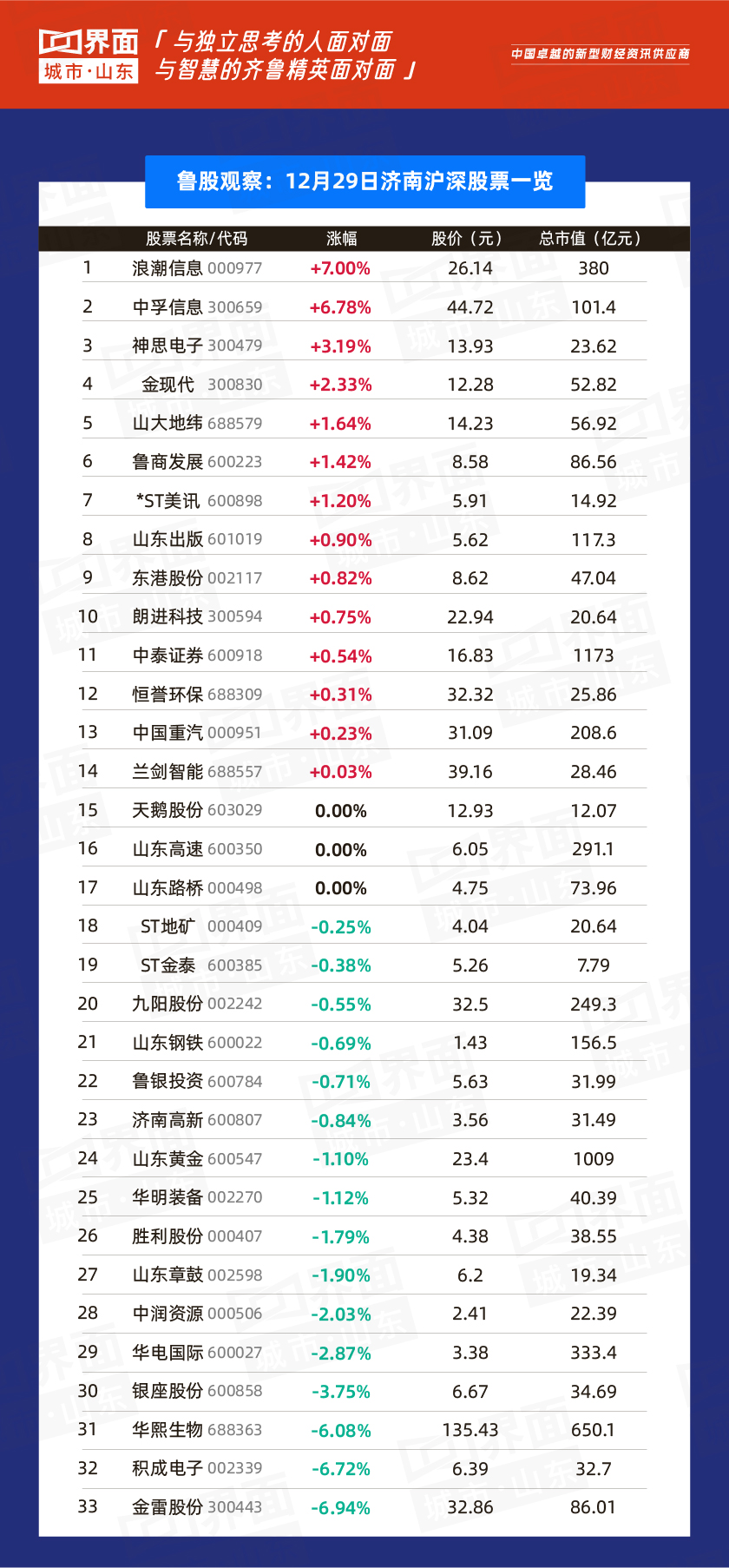 济南市涨幅榜首:浪潮信息(000977),涨幅7.00%,股价26.14元,总市值380亿元;