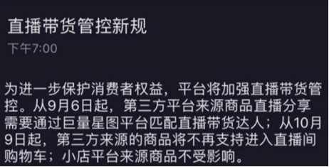 -9月6日起,第三方平台来源商品直播分享需要通过巨量星图平台匹配直播带货达人;10月9日,第三方来源的商品将不再支持进入直播间购物车,小店平台来源商品不受影响,即正式断掉外链;