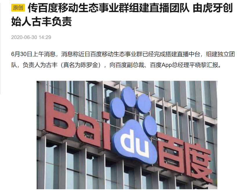 6月,百度移动生态成立了直播业务中台,并请来了虎牙直播的古丰(真名:陈罗金)做百度直播负责人,而虎牙的前身正是由古丰带领团队创建的YY游戏直播。