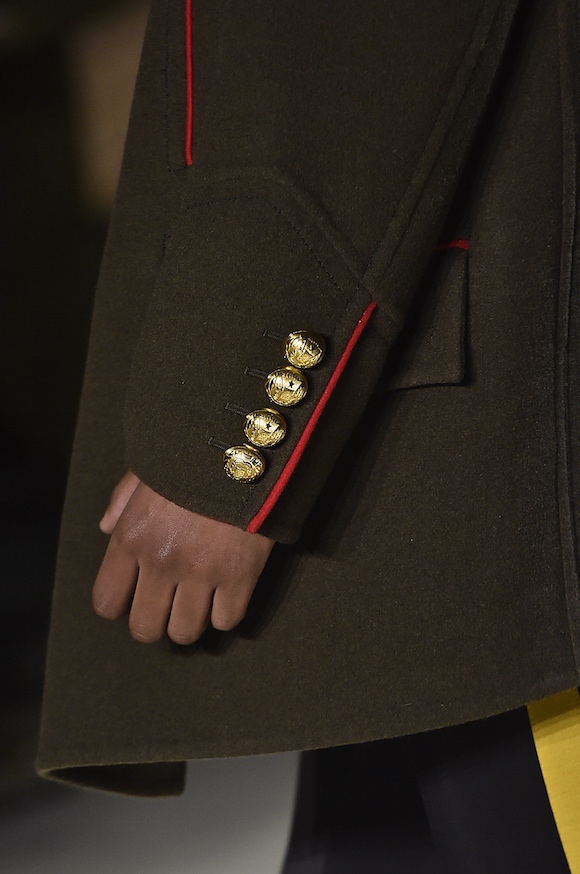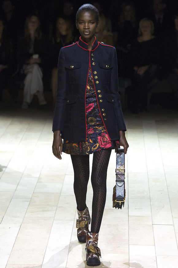 对于Burberry而言,男装周时用过的军装风到了女装周时依旧好用。这不,一开场,模特就穿着一身藏青长款军装呢制大衣亮了相。这为整场秀定下了一个基调——男女同款,尽管还有褶皱、木耳边、花朵印花、亮片、薄纱等让不少单品在硬朗中显示出了足够多的女人味。