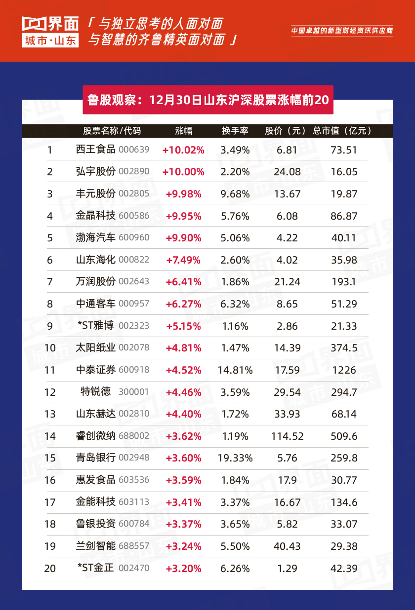 12月30日,山东111股上涨,98股下跌。
