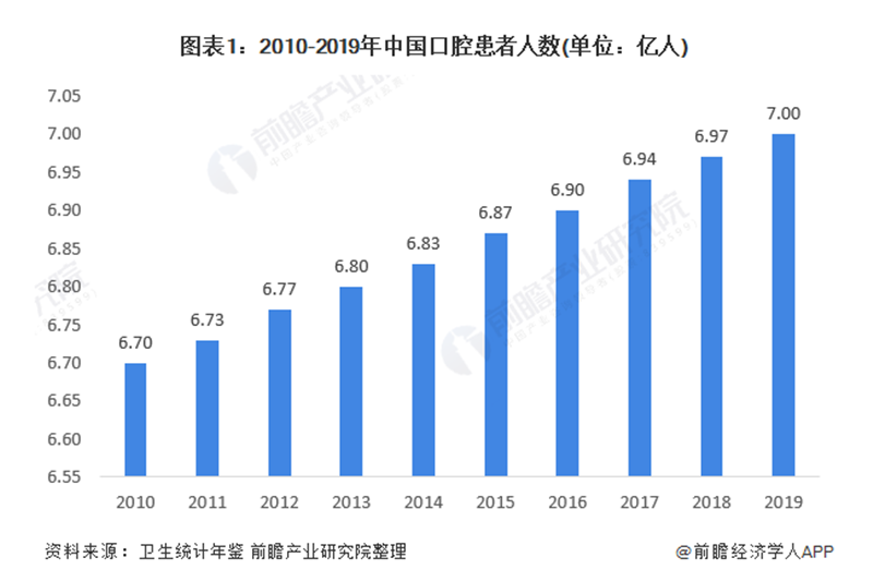 据前瞻产业研究院报告显示,近年来我国口腔疾病患者人数增幅明显,2018年我国患口腔疾病人数约为6.97亿,2019年这个数字达到7亿,这意味着全国有近50%的人都患有口腔疾病。