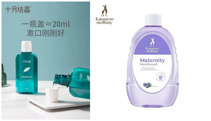 像子初、十月结晶、袋鼠妈妈、贝亲等专注孕妇产前产后护理的品牌,根据这个市场需求推出了孕妇/坐月子专用的漱口水。十月结晶的清新漱口水,添加甘草酸二钾、氯化钠等修护成分,其不辣口的薄荷口感则有助于舒缓孕吐反应;袋鼠妈妈的孕产期漱口水采用自然蓝莓果香,曾连续7年获得天猫双11孕产护肤销量第一,据品牌方介绍,该漱口水还通过了四大国际权威机构认证无矿脂矿蜡矿物油、无滑石粉、无尼泊金酯,以确保对孕妇没有伤害。