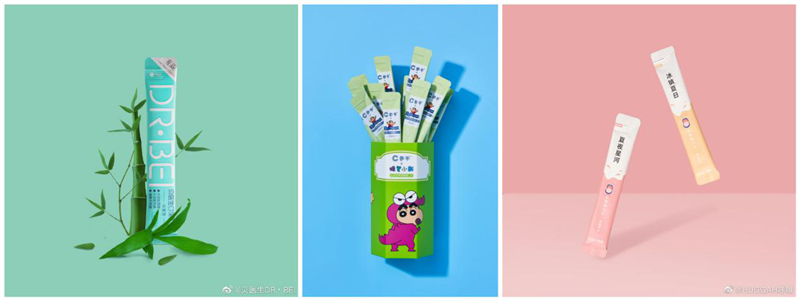 而便携式漱口水主要分为条状和果冻状两类,一袋仅10ml左右。由于激烈的市场竞争,各大品牌在包装、口味等上下足了功夫。贝医生的蜂胶漱口水外包装一粉一蓝,分别对应鲜桃和青竹两种口味;呼嘎的“小瘦条”漱口水,加入了玫瑰草精油/巴西冷榨甜橙精油,有甘甜西瓜和橘子苏打两种水果口味;参半11月推出了蜡笔小新联名款漱口水,添加鼠李糖乳杆菌,有利于重建口腔菌群、减少有害菌。