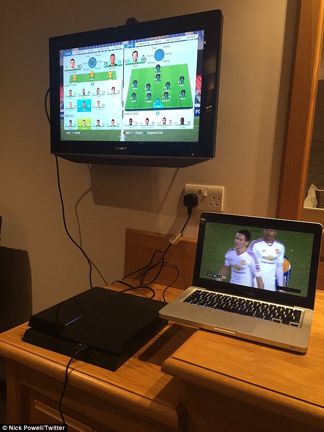 鲍威尔在自己的笔记本电脑上播放着曼联的比赛直播,同时在电视机上玩着FIFA足球游戏。他将这一巧妙的设计发到了自己的推特上并提示了自己的队友大卫•美拿(David Meyler)。