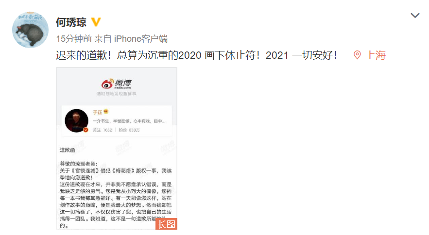 12月31日,编剧于正在个人微博上就《宫锁连城》侵犯《梅花烙》版权一事发布《道歉函》:我知道错了,用了六年正视了这个错误。对此,琼瑶儿媳妇创翊文化CEO、制作人@何琇琼 在微博回应:“迟来的道歉!总算为沉重的2020 画下休止符!2021 一切安好!” 据@新浪娱乐 微博,31日,于正向琼瑶道歉后,琼瑶受访回应,“我看到他的微博了,希望他能知错就改”。