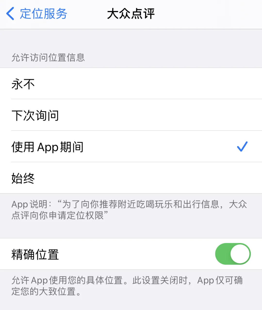 在设置-隐私-定位服务中,除了可以调整App访问位置的频率以外,还可以设置是否使用精确位置。
