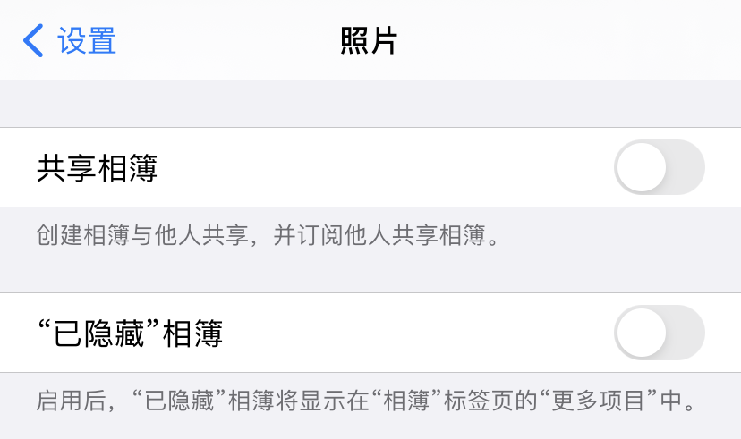 但在iOS 14中,可以关闭这个“鸡肋功能”,在设置-照片里关闭“已隐藏相簿”,就等于整个相簿被隐藏了,不用担心隐私照片被“无意”翻出。
