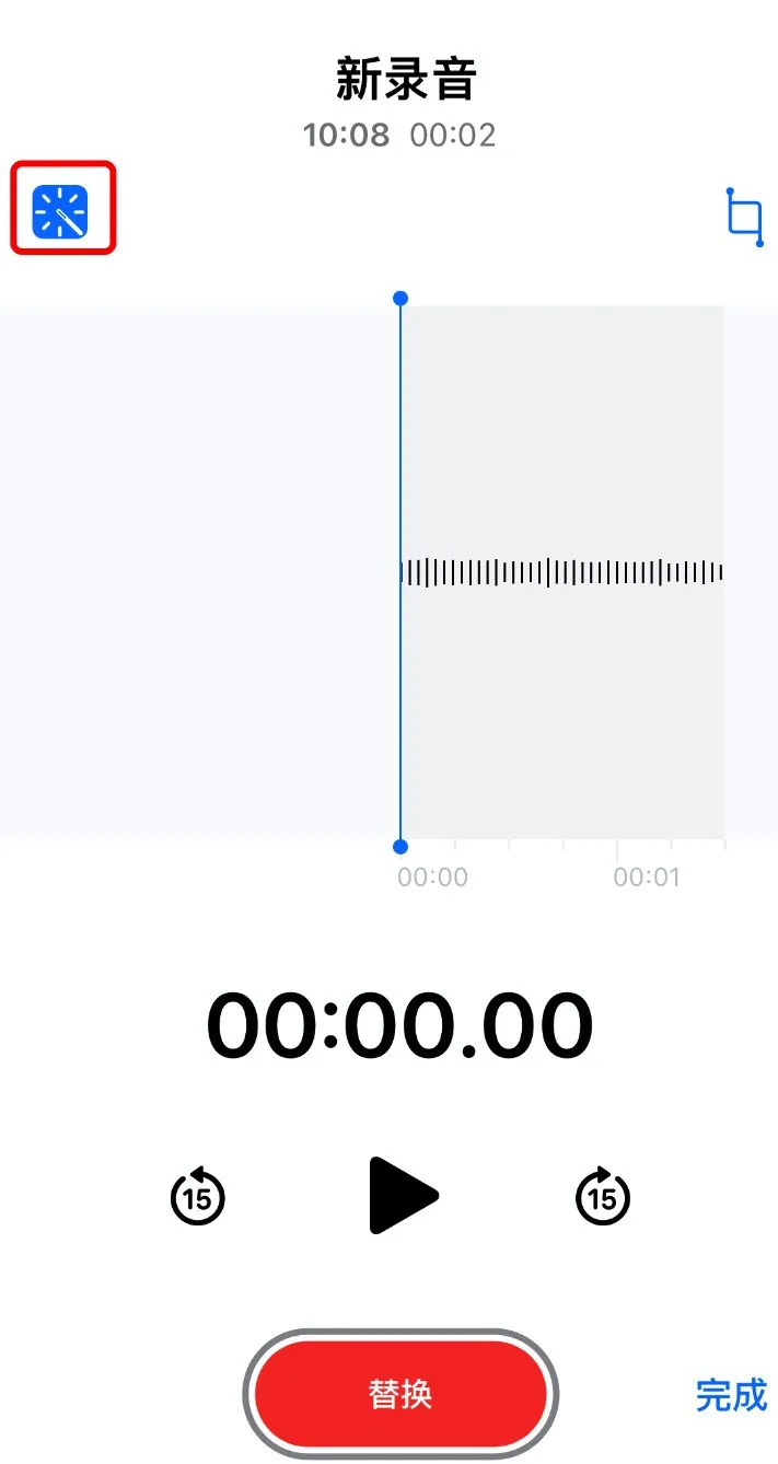 首先打开语音备忘录,录制一段语音之后,点击“编辑录音”,再点击左上角的魔棒即可开启增强,自动消除这一段录音中的噪音。