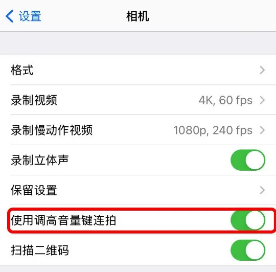 但其实只要在设置中操作一下,就可以拯救“小手党”,在设置-相机中打开“使用调高音量键连拍”。