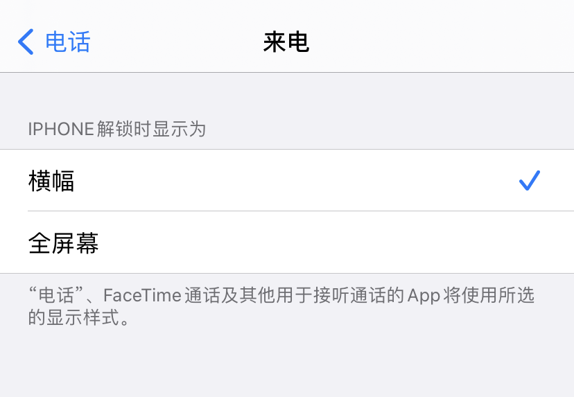 不过,当来电显示成为横屏之后,容易错过一些电话,尤其是当静音的时候,因此,有果粉用户还是喜欢此前全屏幕的来电显示。要改回以前的风格,可以在设置-电话-来电中调整回原来的全屏幕展示即可。