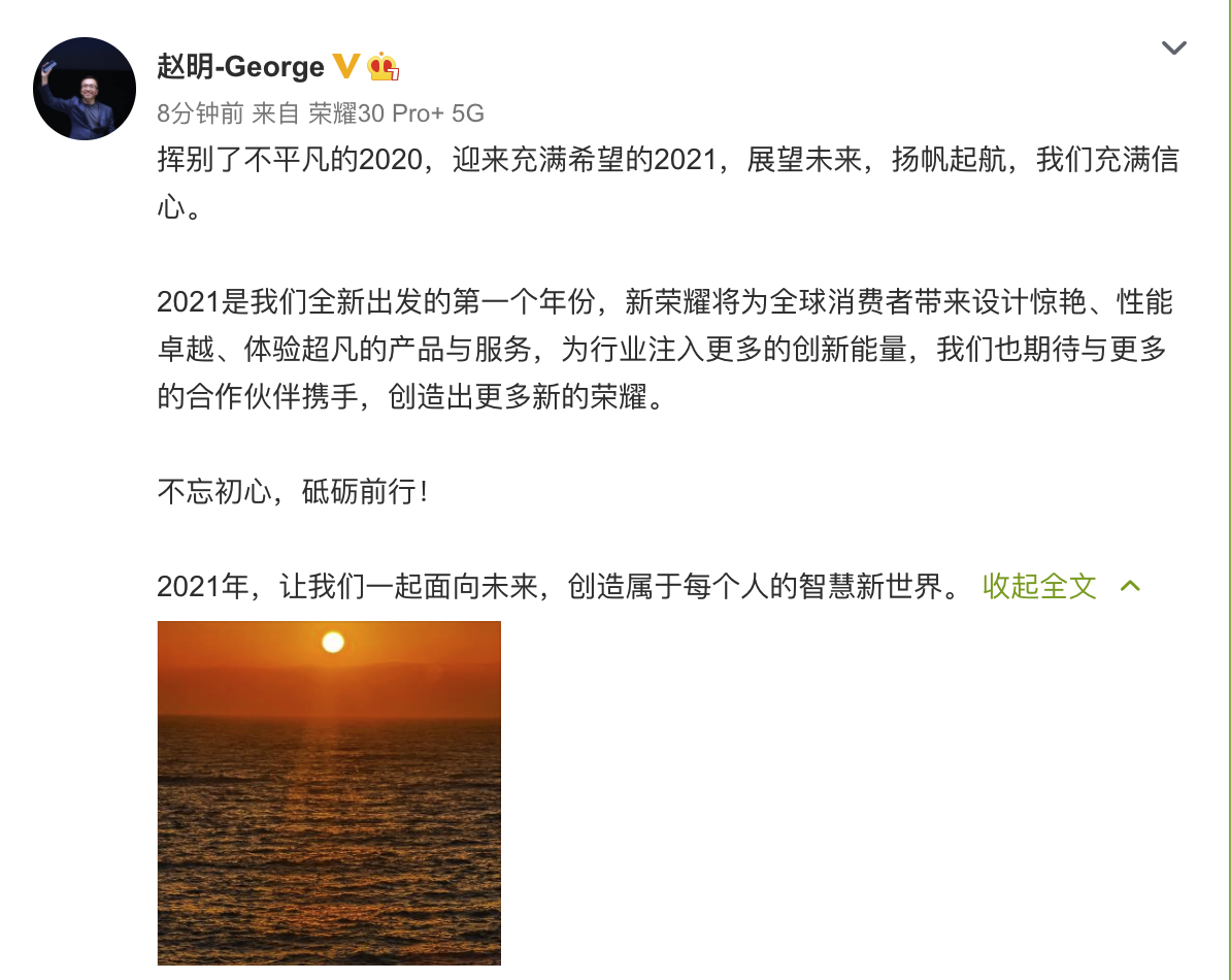 1月1日上午,荣耀终端有限公司CEO赵明通过个人微博@赵明-George 微博发文称,“2021是我们全新出发的第一个年份,新荣耀将为全球消费者带来设计惊艳、性能卓越、体验超凡的产品与服务,为行业注入更多的创新能量,我们也期待与更多的合作伙伴携手,创造出更多新的荣耀。”