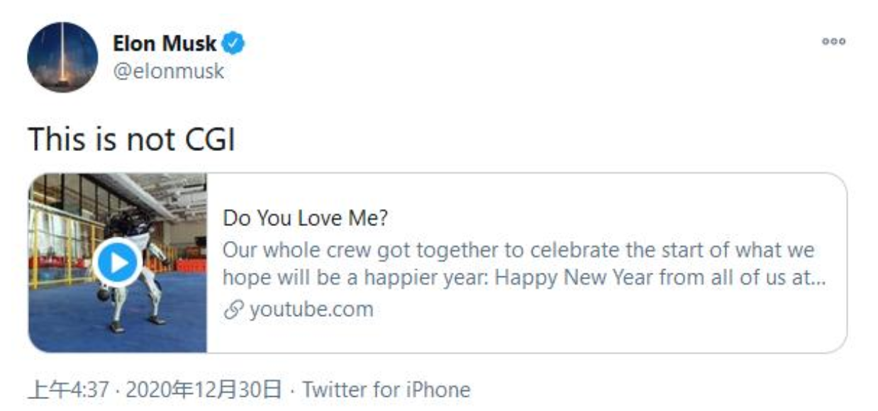 特斯拉首席执行官埃隆·马斯克(Elon Musk)甚至在其社交媒体平台上转发并感叹道:这不是CGI(电脑三维动画)。