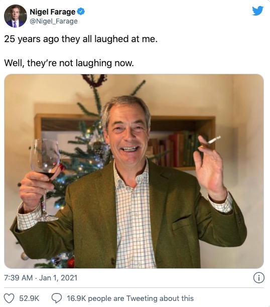长达5年的脱欧拉锯战终于结束,给不少英国人的跨年多添一重喜悦。前独立党领导人法拉奇(Nigel Farage)在推特上发了一张举着红酒杯、朝镜头笑的照片,并写道:“25年前他们都嘲笑我,但现在他们笑不出来了。”他是一名坚定的脱欧派政客。