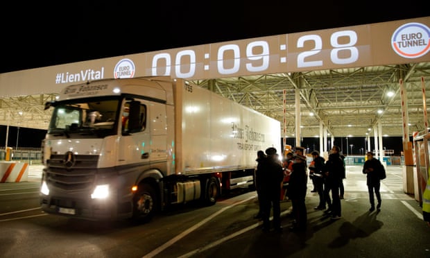 第一批英国货车向法国海关提交了清关文件,在格林尼治标准时间23时9分左右顺利通关,登上高铁穿过英法海底隧道前往法国,并于24时23分抵达法国。