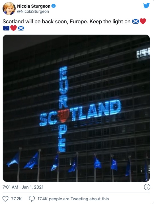 但脱欧给另一些人带来的却是遗憾和失落。苏格兰政府首席大臣斯特金(Nicola Sturgeon)在推特上发文称,苏格兰“很快”就会重新加入欧盟,并配上一张比利时布鲁塞尔欧盟委员会总部大楼外亮起苏格兰灯光的照片。