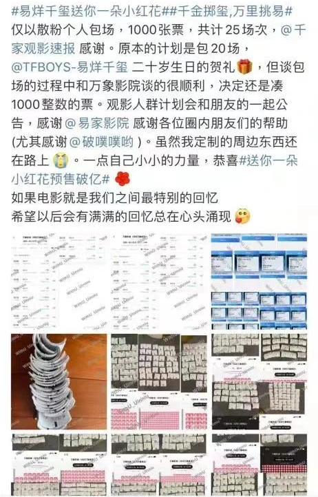 但粉丝组织的包场要考虑的因素则更多。从后援会微博来看,目前主要有公益包场、高校保持、粉丝包场和所谓“个人包场”,和粉丝包场的区别在于,前者通过后援会统一组织,后者则是粉丝个人出资并和影院联系,按专门负责包场信息的微博@千家观影速报的说法,这是“散粉的心意”。“散粉”的力量,也在易烊千玺身上真切地感受到。